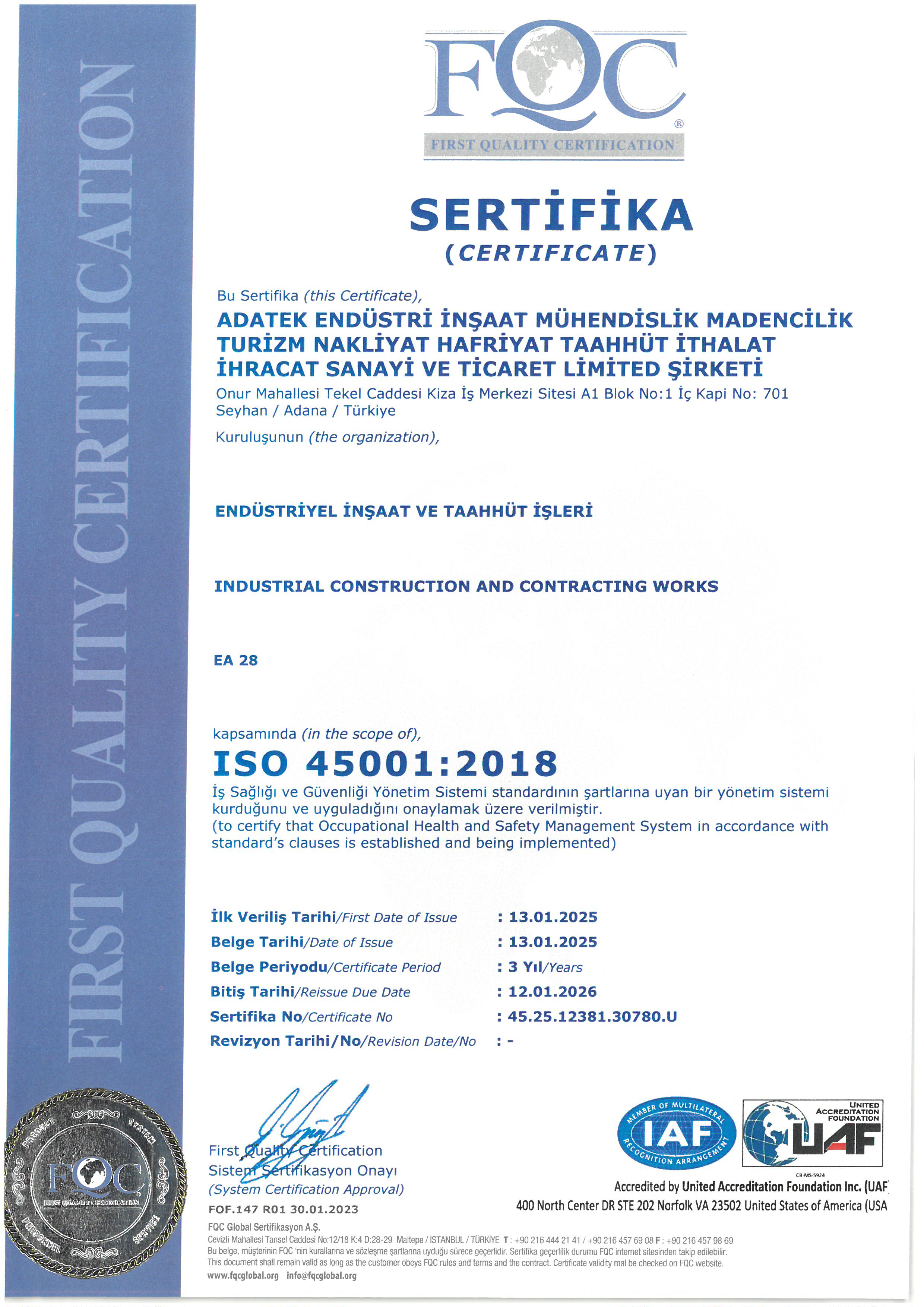 | OHSAS 18001:2007 | FQC 01.17.6692.112080.T | OHSAS 18001, BSI tarafından yayınlanmış "iş sağlığı ve güvenliği" standardıdır. Bu standardı ISO 9001 veya ISO 14001 gibi standartlardan ayıran önemli unsurlardan birisi; OHSAS 18001'in, ürün veya hizmetin güvenliğinden çok, iş sağlığı ve güvenliğine yönelik olmasıdır. |