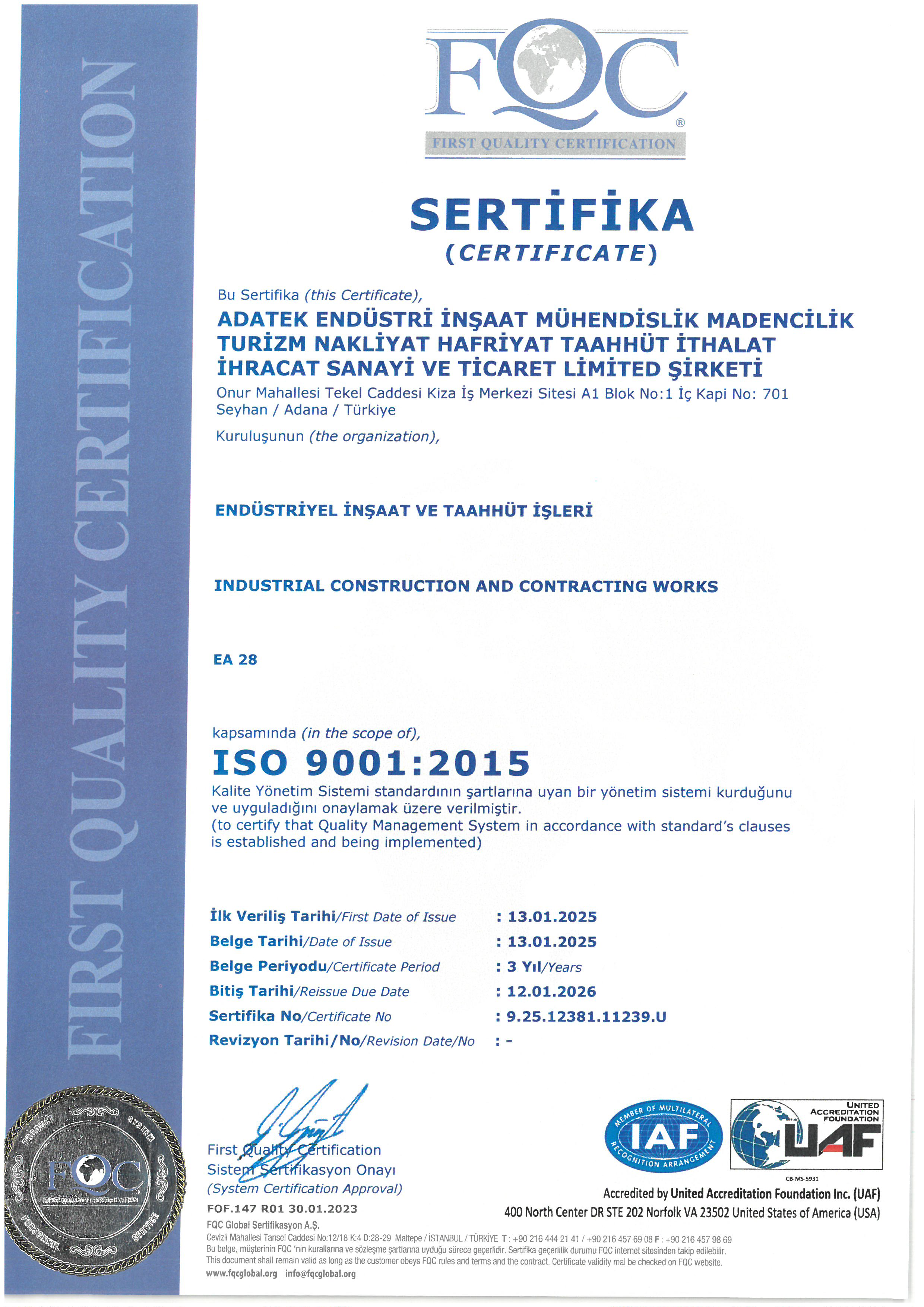 | ISO 9001:2015 | EA 28 | ISO 9001 Kalite Yönetim Sistemi, müşteri beklentileri, ihtiyaçları ve mevzuat şartlarını karşılama yolu ile müşteri memnuniyetinin artırılmasını öngören dünyaca kabul görmüş bir kalite yönetimi sistemi biçimidir. |